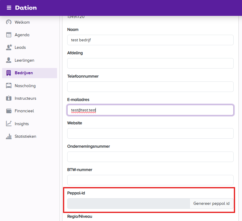 De Rijschool moet per administratie via Beheer - rijschool gegevens de eigen Peppol ID instellen