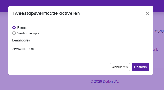 - In de modal is het mogelijk te kiezen uit 2 opties voor tweestapsverificatie: