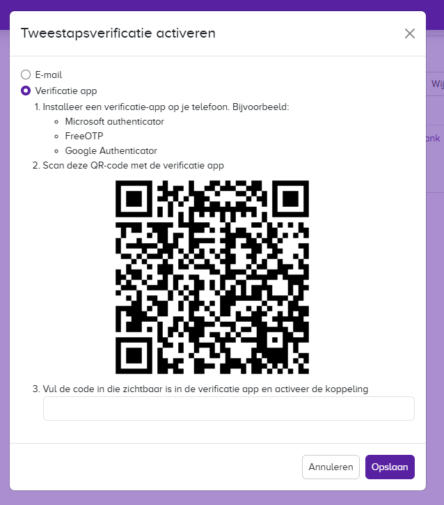 - Verificatie app: installeer een authenticator app naar keuze. Scan de QR code met je telefoon en vul vervolgens de code in die je terugkrijgt in de authenticator app om deze vorm van tweestapsverificatie te activeren.